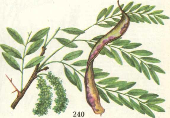 239 ГЛЕДИЧІЯ КАСПІЙСЬКА гледичия каспийская Gleditschia caspia — невелике, 10—12 м заввишки, однодомне дерево родини бобових. Має великі нерозгалужені колючки. Листки непарноперисті або двоперисті. Квітки дрібні, одностатеві, зигоморфні (див. Зигоморфна квітка), зеленкуваті, в прикорочених пазушних китицях. Плід — біб. Цвіте у червні. Поширення. Походить з Північної Америки. На Україні розводять як декоративне дерево в садах і парках Заготівля і зберігання, хімічний склад, фармакологічні властивості і використання, лікарські форми і застосування — усе так, як у статті Гледичія колюча.