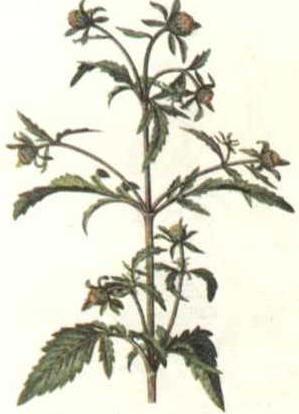Это однолетнее травянистое растение высотой до 1 м, с разветвленным стержневым корнем. Стебель прямостоячий, ветвящийся почти до основания. Листья супротивные, с короткими черешками, глубоко трех- или пятираздельные, зубчатые, длиной до 7 и шириной 4 см. Цветки мелкие, желтые, трубчатые, на концах ветвей собраны в корзинки диаметром до 2 см. Плоды - сплюснутые семянки с двумя-тремя ребрами, длиной до 8 и шириной 3,5 мм.