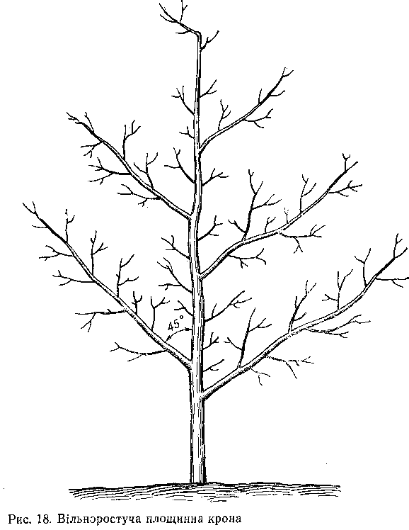 У садах з площинними кронами, а також у шпалерно- карликових садах основним типом крони є вільноростуча площинна крона та її модифікації (рис. 18). У період формування крони закладають 2—3 яруси скелетних гілок у напрямі ряду. Скелетні гілки спрямовують під кутом 45—55° до центрального провідника. Висота штамба для дерев на сильнорослих підщепах становить 60—70, на айві — 40—50 см. Відстань між ярусами 60—80 см. Обростаючі гілочки формують на центральному провіднику та скелетних гілках на відстані 15—25 см одна від одної.